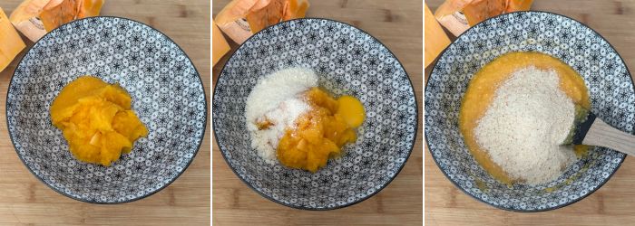 Trasferite il purè di zucca in una ciotola e aggiungete il sale, il parmigiano e l’uovo.