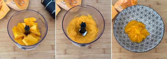 Con un cucchiaio, scavate la zucca e mettetela nel mixer o schiacciatela con una forchetta.