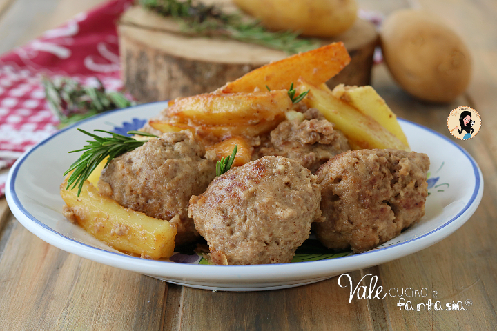 Si preparano le polpette di carne nella maniera classica con carne macinata, uovo, pane ammollato, parmigiano, prezzemolo, sale, si lasciano cuocere le polpette in padella e poi si aggiungono le patate a spicchi, qui me la sono studiata un po’ lo confesso, nel senso che le patate tagliate a spicchi ci mettono un po’ a cuocere rispetto alle polpette di carne, e la mia paura era che ci ritrovassimo delle polpette troppo cotte e secche, quindi io ho sbollentato le patate prima di aggiungerle alla carne, in questo modo la cottura è stata uniforme e le patate le ho dovute solo far rosolare e attendere che prendessero il sapore delle polpette.