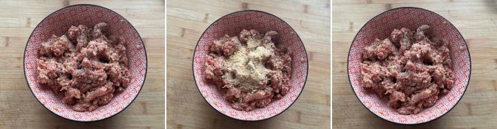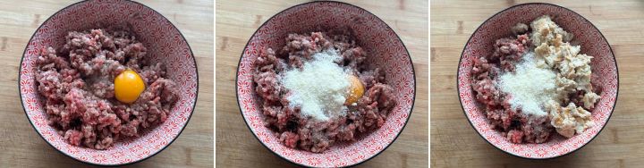 Mettete in una ciotola la carne macinata con l’uovo, il parmigiano, il panino ammollato e strizzato e il sale.