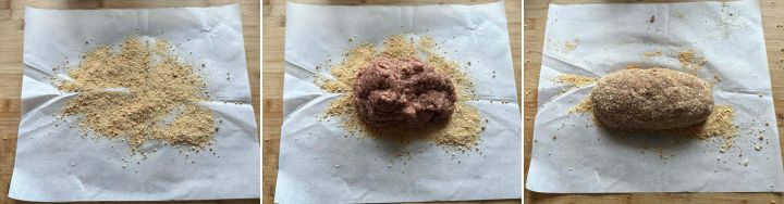 Mettete al centro l‘impasto di carne e con le mani date la forma del polpettone cercando di sigillarlo completamente con il pangrattato.