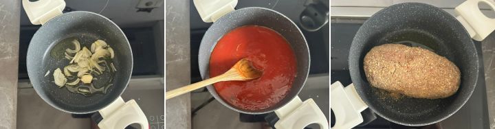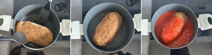In un tegame a parte mettete l‘olio extra vergine di oliva e il polpettone di carne.