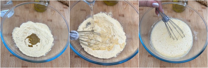 Per preparare le crespelle con farina di ceci per prima cosa mettete la farina di ceci in una ciotola, aggiungete il sale, il pepe, l’olio extra vergine d’oliva e l‘acqua.