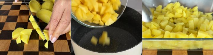 Tagliate le patate a dadini e mettetele in una pentola con l’acqua, fatele bollire per circa 10 minuti lasciandole un po’ indietro di cottura, scolatele, aggiungete olio, sale e pepe e lasciatele raffreddare.