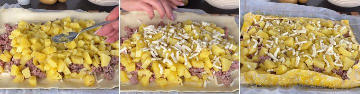 Mettete sulla pasta sfoglia la provola, le salsicce e le patate.