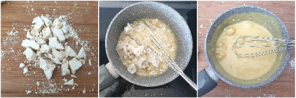 Togliete il liquido dal calore ed unite il torrone precedentemente tagliato a pezzetti, rimettete sul calore e mescolate continuamente fino a completo scioglimento del torrone.