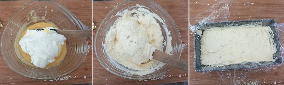 Versate il composto di uova e torrone in una ciotola ed aggiungete poco per volta la panna montata, mescolate con una spatola dal basso verso l’alto e versate il composto del semifreddo al torrone in uno stampo per plumcake foderato con la pellicola trasparente.