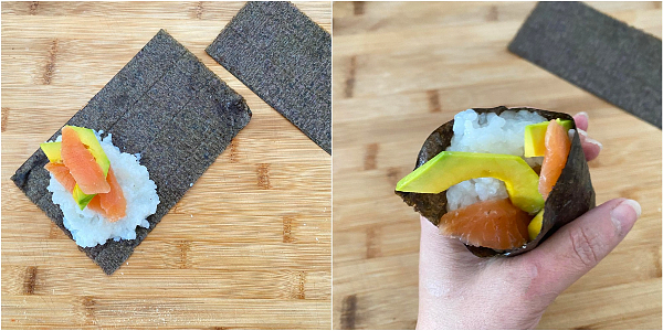Mettete sull’alga l’avocado e il salmone, anche qui potete aggiungere maionese o wasabi.