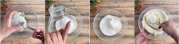 Mescolate lo yogurt con lo zucchero con una frusta a mano per ottenere una crema liscia e morbida.