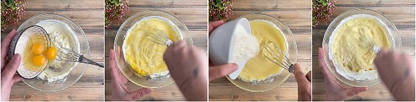 Aggiungete alla crema di yogurt le uova intere e continuate a mescolare fin quando saranno completamente assorbite.