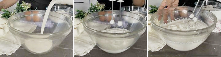 In una ciotola a parte rompete le uova intere, azionate le fruste ed iniziate a versare lo zucchero a pioggia.
