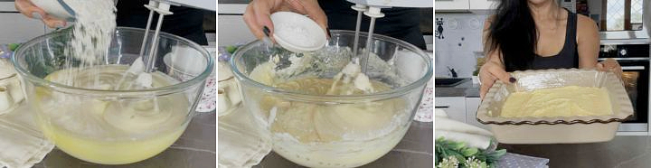 Iniziate ad aggiungere anche la farina poco per volta ed infine il lievito per dolci, quando avrete ottenuto un composto omogeneo e compatto, versatelo nella tortiera imburrata.