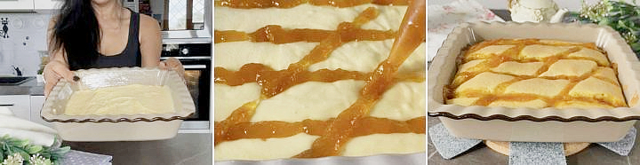 Trascorso questo tempo, togliete il dolce alla panna dal forno, ovviamente non sarà cotto, ma avrà la giusta consistenza per realizzare le strisce di marmellata in modo che non affondino.