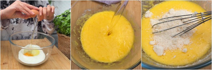 Aggiungete alla crema di yogurt e uova l‘olio di semi ed il parmigiano grattugiato, mescolate ancora l’impasto della Brioche allo yogurt e aggiungete anche la farina 00 ed il lievito per torte salate.
