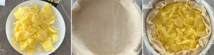 Mettete all’interno della pasta sfoglia le patate a fettine e ripiegate i bordi verso l’interno.