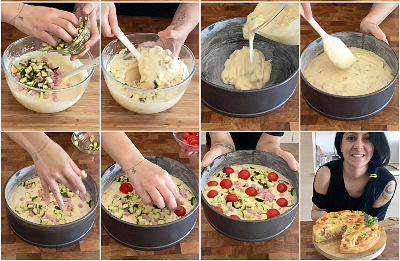 In questa torta salata io ho messo nell’impasto zucchine a dadini e prosciutto cotto, poi ho farcito la superficie sempre con zucchine, prosciutto e pomodorini, quindi una torta ricca perfetta sia come antipasto, aperitivo e piatto unico, una ricetta ottima da trasportare per una gita o semplicemente per una merenda salata.
