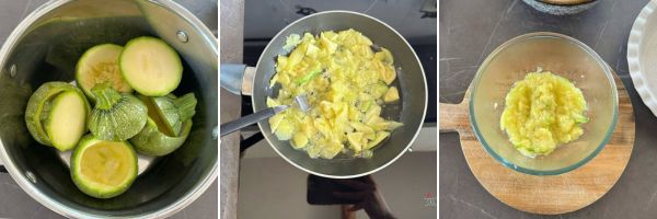 La polpa delle zucchine mettetela in una padella, fatela cuocere con un pizzico di sale e poi schiacciatela con una forchetta.