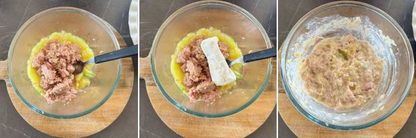 Aggiungete alla polpa di zucchine il tonno sott’olio ben sgocciolato e il formaggio cremoso, mescolate fino ad ottenere una crema, assaggiate e se occorre aggiustate di sale.