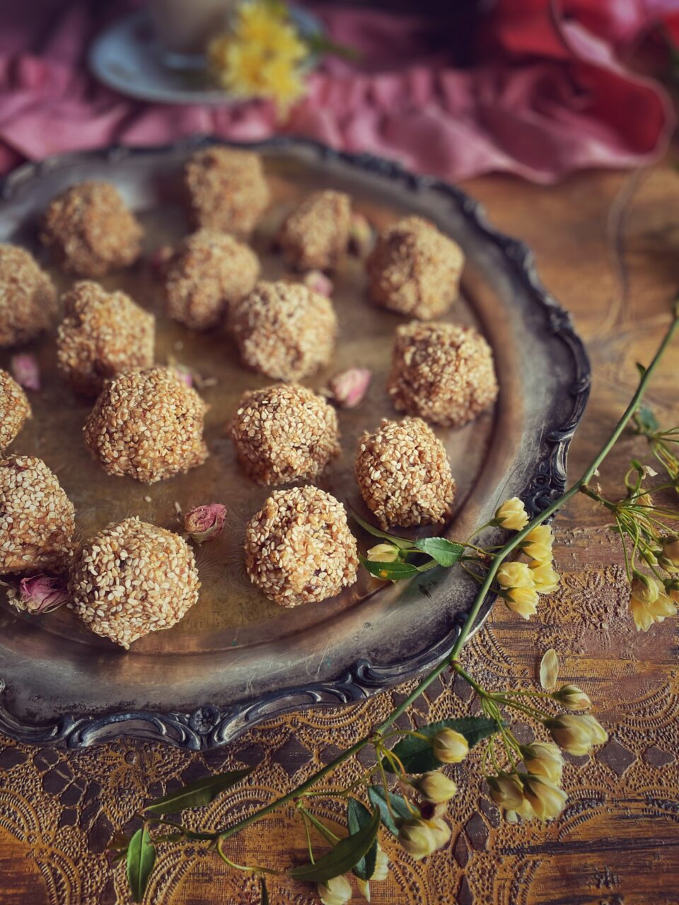 Finitura: Rotola ogni pallina nei semi di sesamo tostati finché non sono completamente ricoperte.