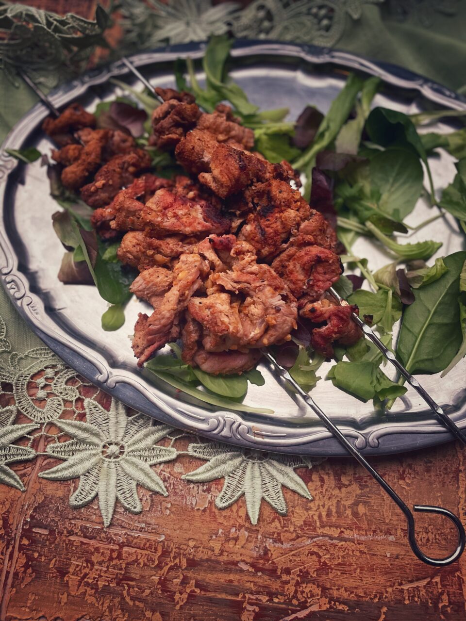 Infilzamento: Inserisci la carne sugli spiedini in modo compatto (a fisarmonica). Lascia riposare 20-30 minuti a temperatura ambiente per far aderire il mix.
