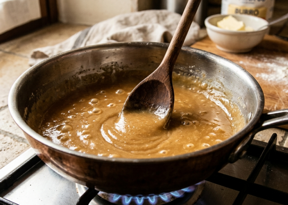 C’è un momento critico, quando l’arrosto è pronto ma il fondo di cottura resta lì, slegato e timido sul fondo della teglia. È in quel momento che lo Chef tira fuori il suo asso nella manica. Non è magia, è il “Lingotto d’Oro”: un cubetto di Roux che riposa in freezer, pronto a tuffarsi nel calore per trasformare un liquido anonimo in una salsa lucida, densa e regale. È l’abbraccio che sigilla il sapore della carne e lo rende eterno.