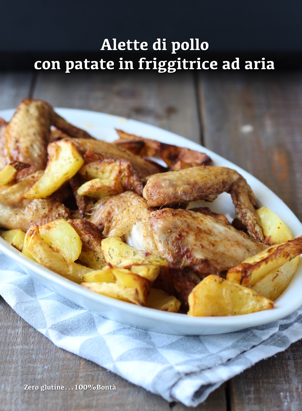 Alette di pollo e patate in friggitrice ad aria, un secondo saporito dal successo assicurato, che piacerà a tutti; ideale da servire a una cena tra amici e non solo.