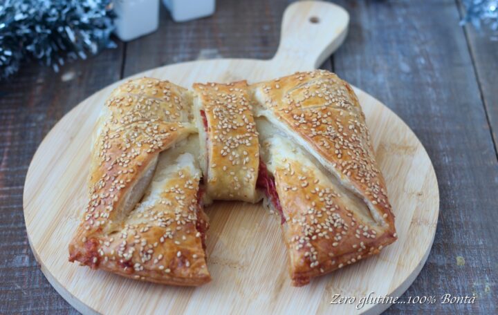 In questa versione, il ripieno è ricco e saporito: salame, scamorza filante e carciofini, un abbinamento equilibrato che unisce gusto e cremosità. La sfoglia, intrecciata a formare un elegante fiocco, diventa croccante fuori e irresistibile dentro.