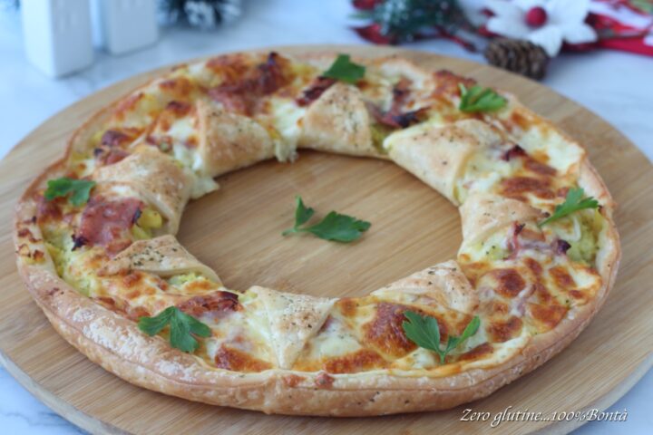 Ghirlanda di pasta sfoglia con patate, prosciutto e scamorza, senza glutine, veloce e scenografica, ideale da servire per le feste di Natale e Capodanno. Molto semplice da realizzare e abbastanza veloce la Ghirlanda di pasta sfoglia con patate è un antipasto davvero gustoso. Vi basterà srotolare un rotolo di pasta sfoglia rotondo, farcire e dare la forma di una ghirlanda.