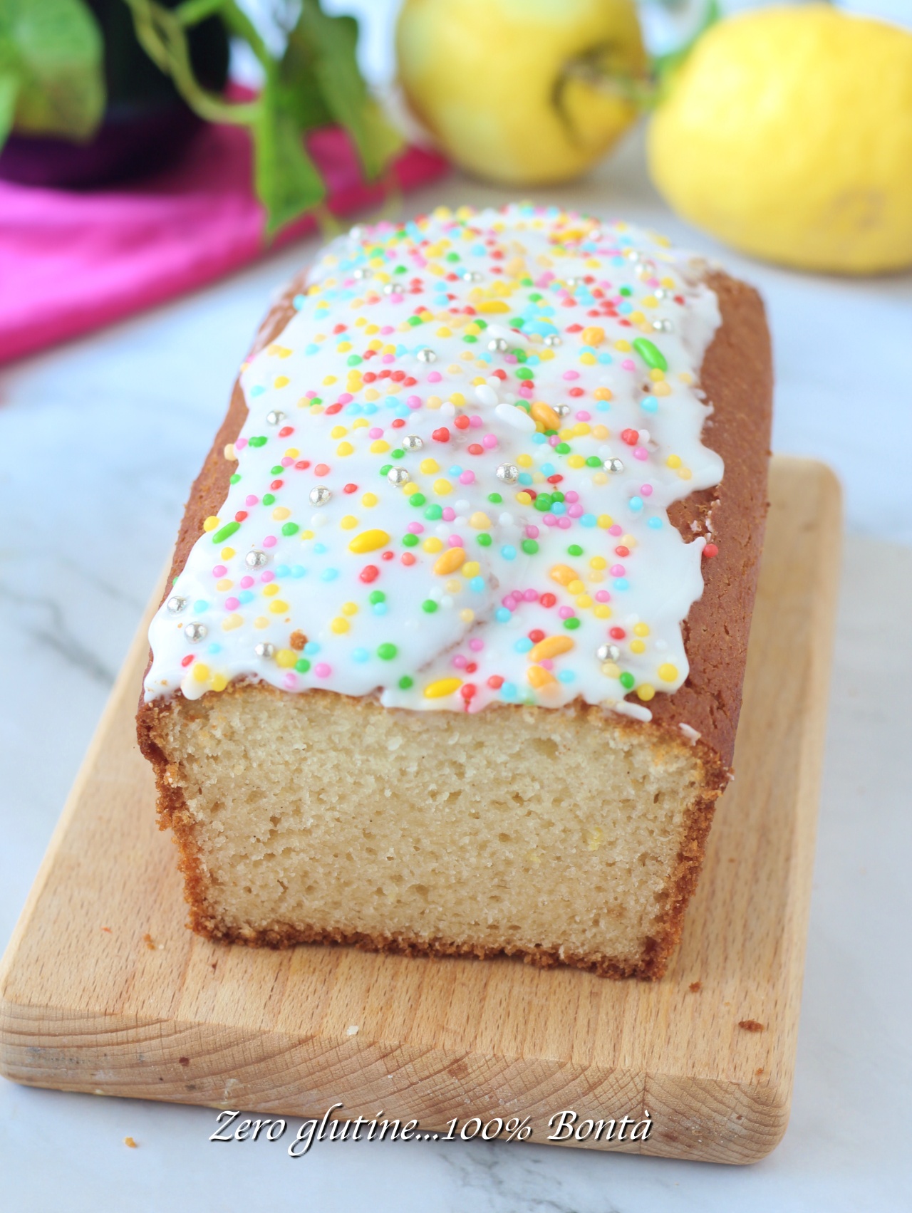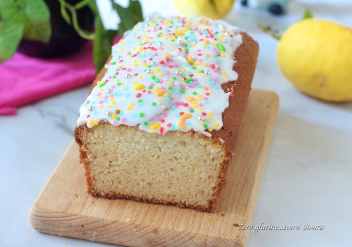 Soffice plumcake allo yogurt senza glutine aromatizzato con scorza di limone, facile e veloce da preparare. Perfetto per la colazione o la merenda, con una golosa glassa al limone e confettini colorati.