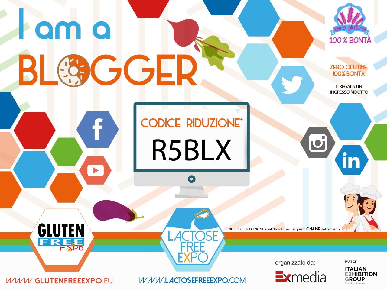 Con la ricetta della Torta di banane e noci vi ricordo che anche quest’anno ci sarà il Gluten free Expo che si terrà a Rimini dal 17 al 20 Novembre, e io sono una delle blogger ufficiali. Qui sotto vi lascio il mio codice sconto da inserire sul sito prima di acquistare il biglietto d’ingresso per l’expo. Mi raccomando, non mancate!